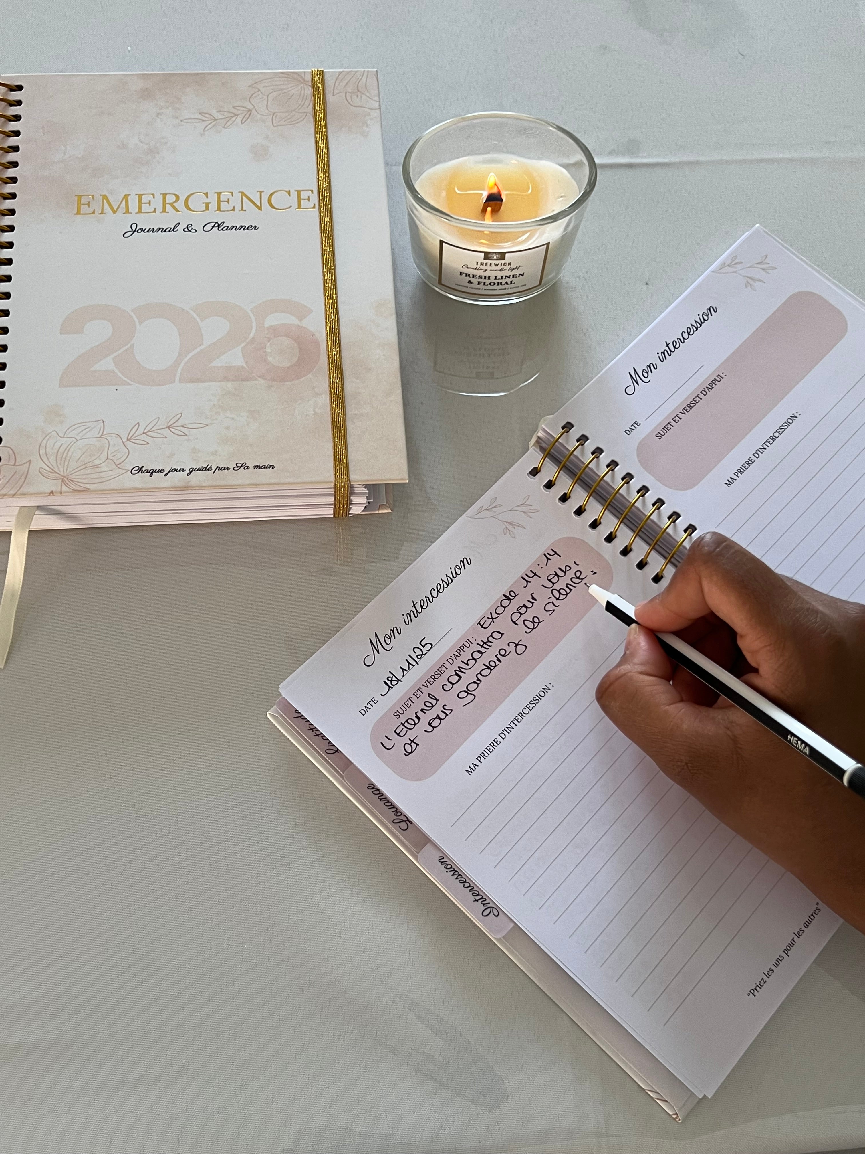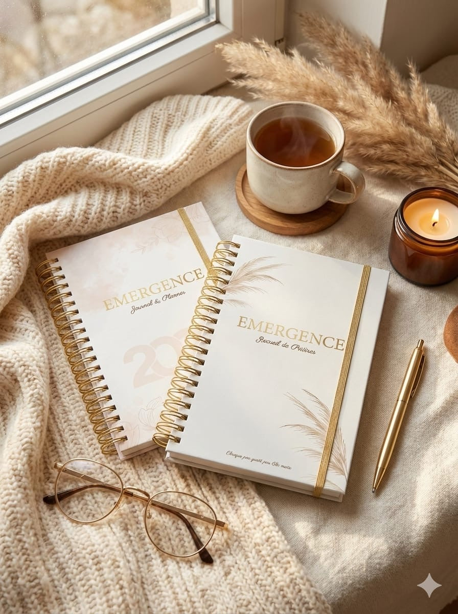 Émergence est née d’un désir précis : ordonner sa vie de prière avec douceur et constance. Dans un monde saturé de vitesse, j’ai choisi l’écriture : un geste calme, noble, essentiel pour retrouver la clarté, suivre les demandes, reconnaître les exaucements, et avancer avec fidélité.